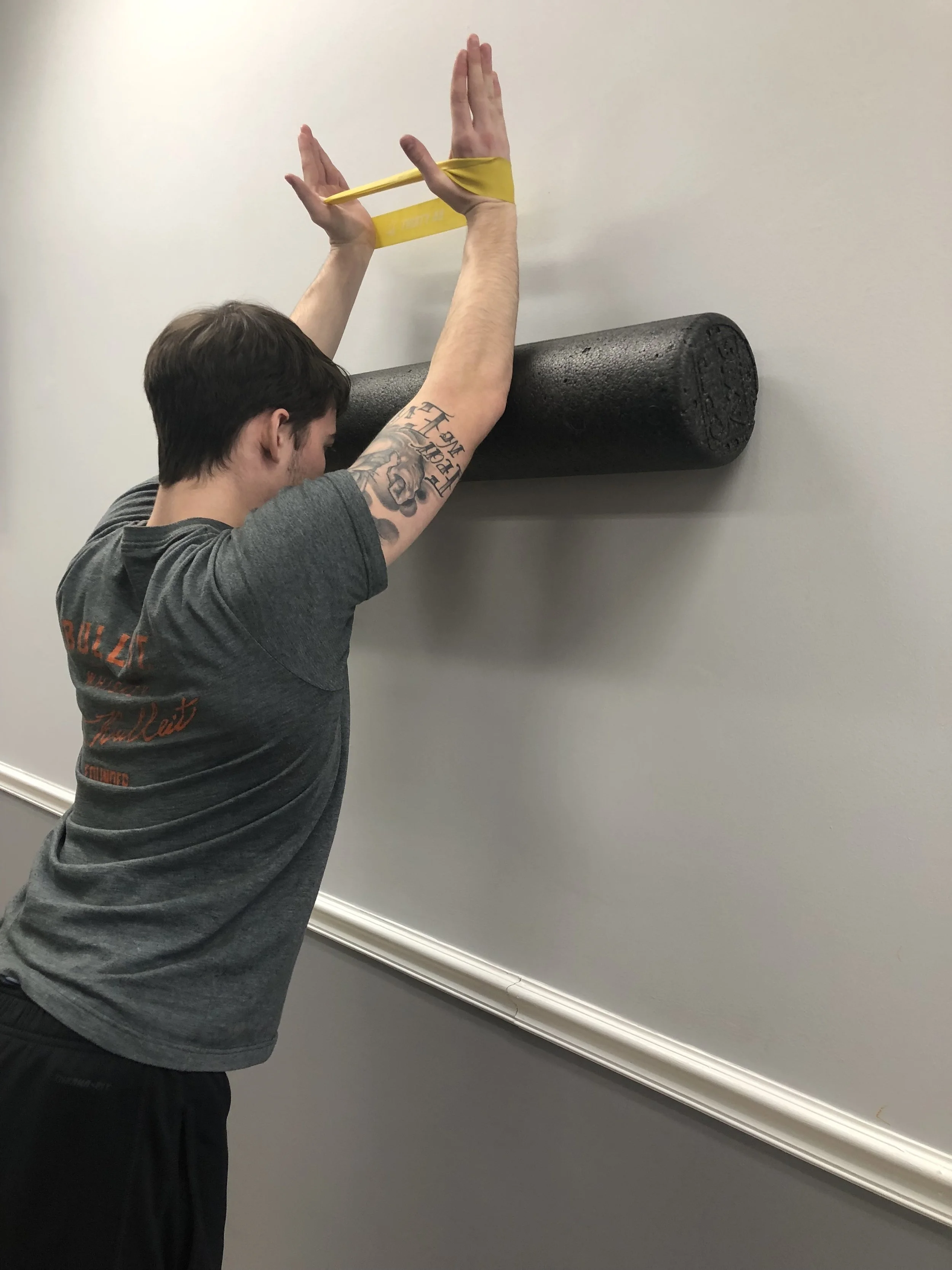Begin by placing a foam roller on the wall with a band around both of your wrist. You will place your wrists on the foam roller about chest high.
